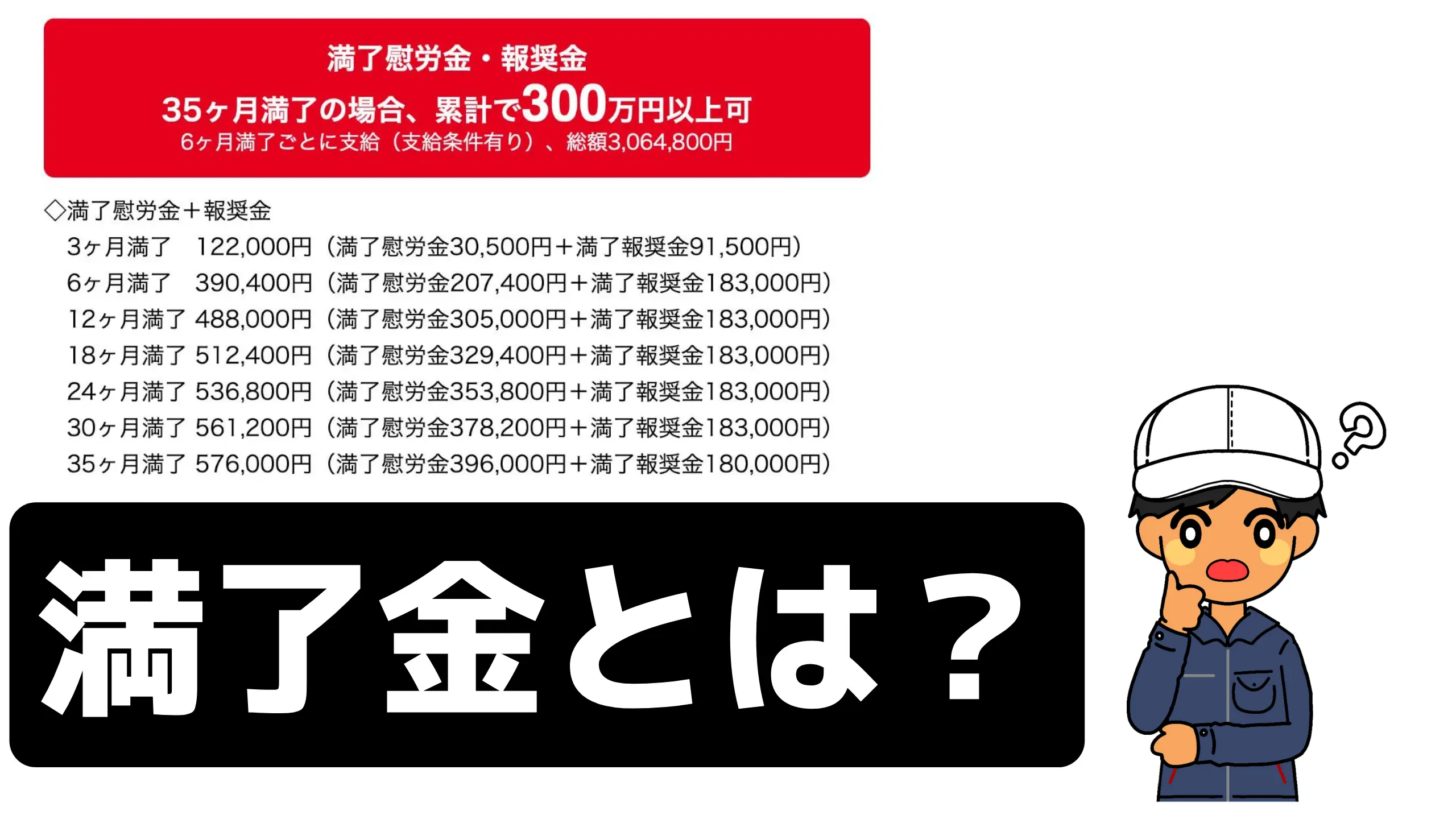 35ヶ月満了 576,000円(満了慰労金396,000円+満了報奨金180,000円)