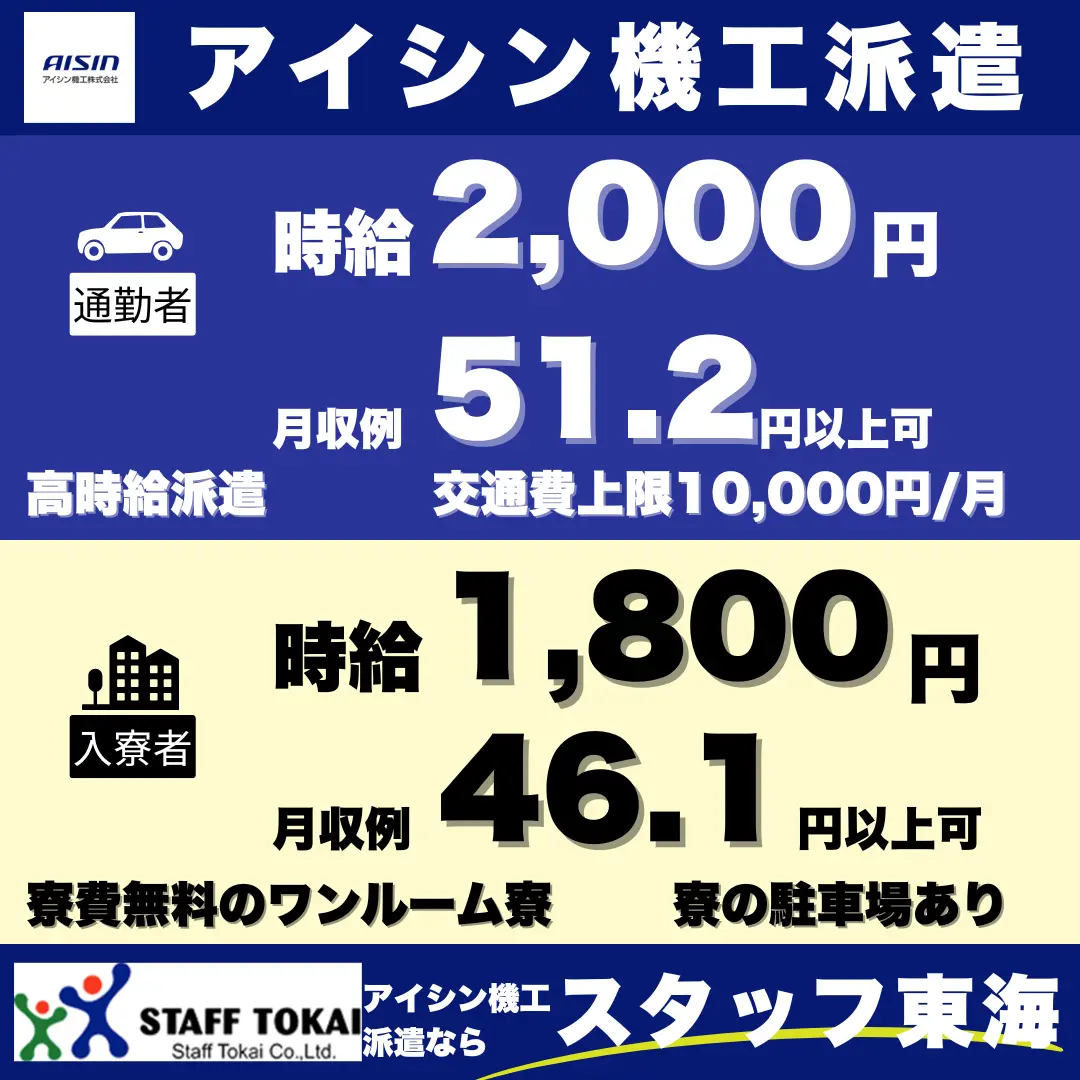 【入社祝い金100万】愛知県に工場が点在しているアイシン。トヨタ系のトランスミッションを多く生産。入社祝い金は半年で全額回収可能。時給も1,500円と高い。最初の半年だけであれば最も稼げる期間工。寮もワンルームなので相部屋が苦手な方におすすめ。