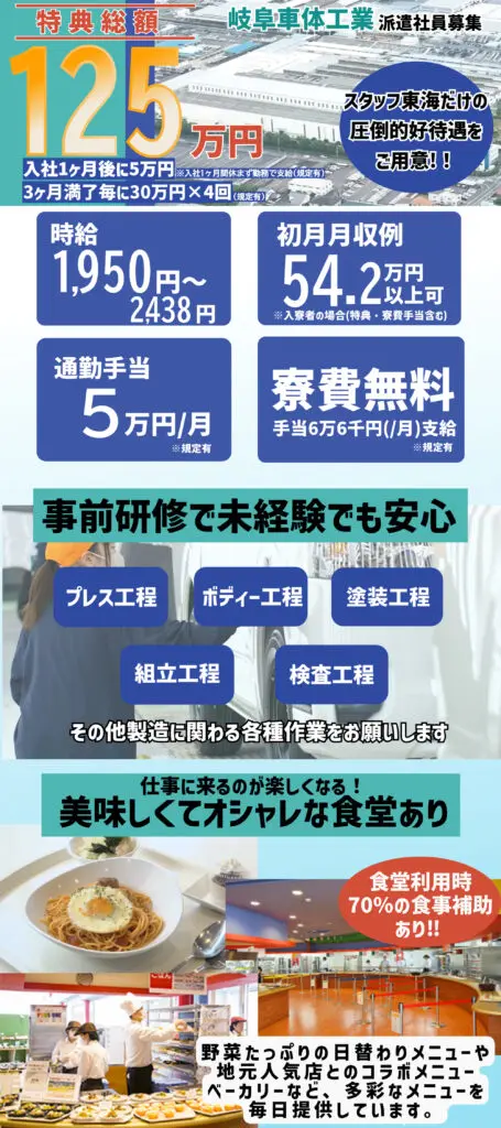 | 待遇・福利厚生 | ・社員食堂完備 ・食事補助あり ・正社員登用制度あり ・各種社会保険完備 ・スタッフ東海のサポート(待機寮、模擬面接、赴任費前払い) ※すべて規定あり |