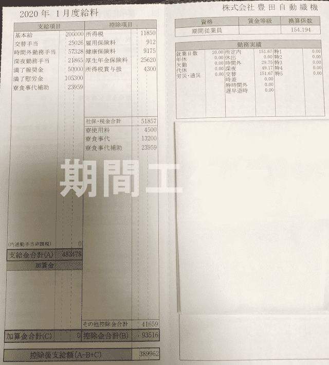 【1ヶ月目】豊田自動織機の期間工の初任給は合計494,709円(入社祝い金含)